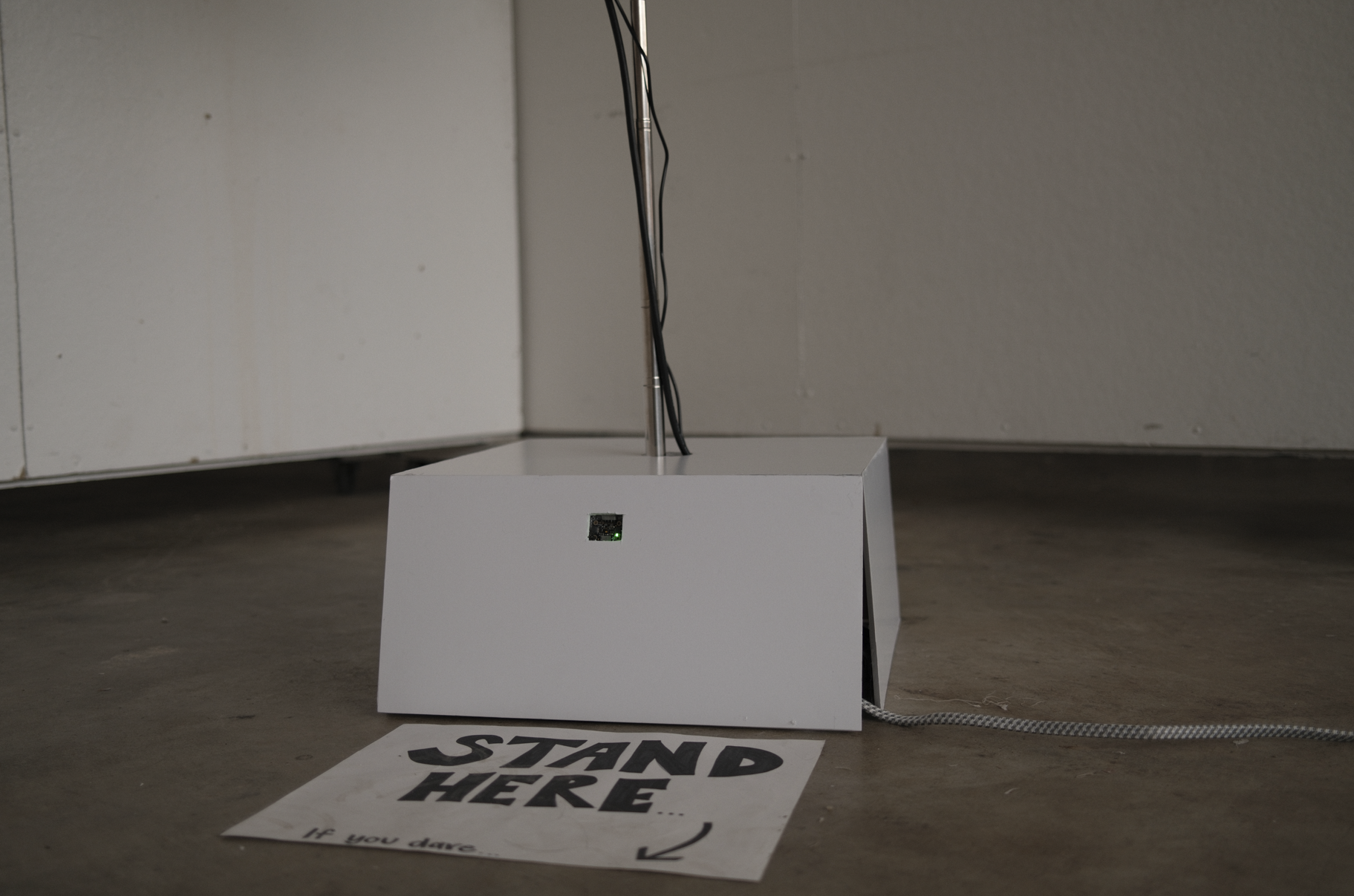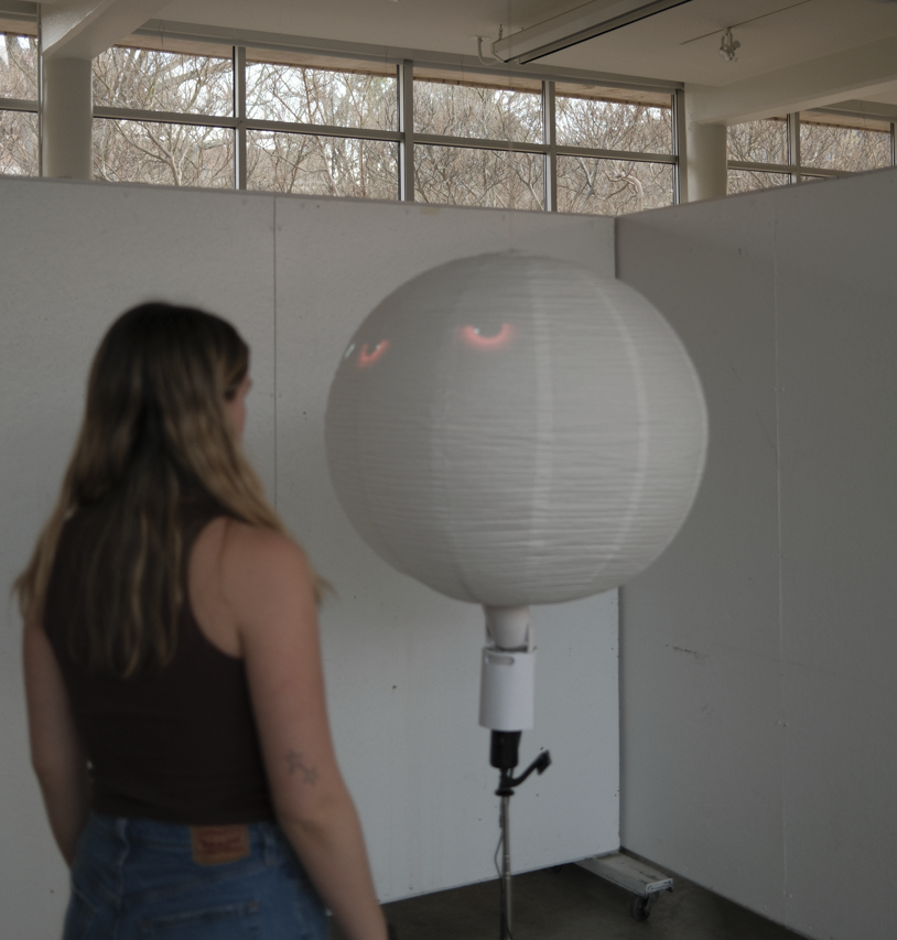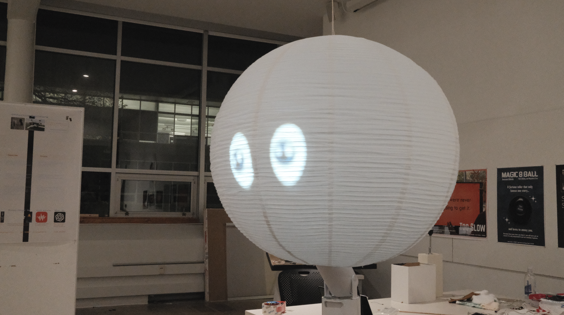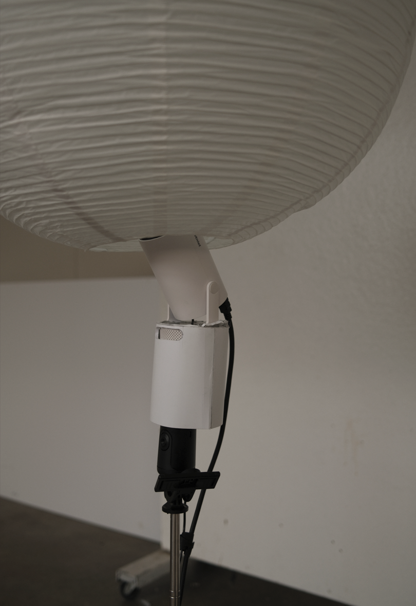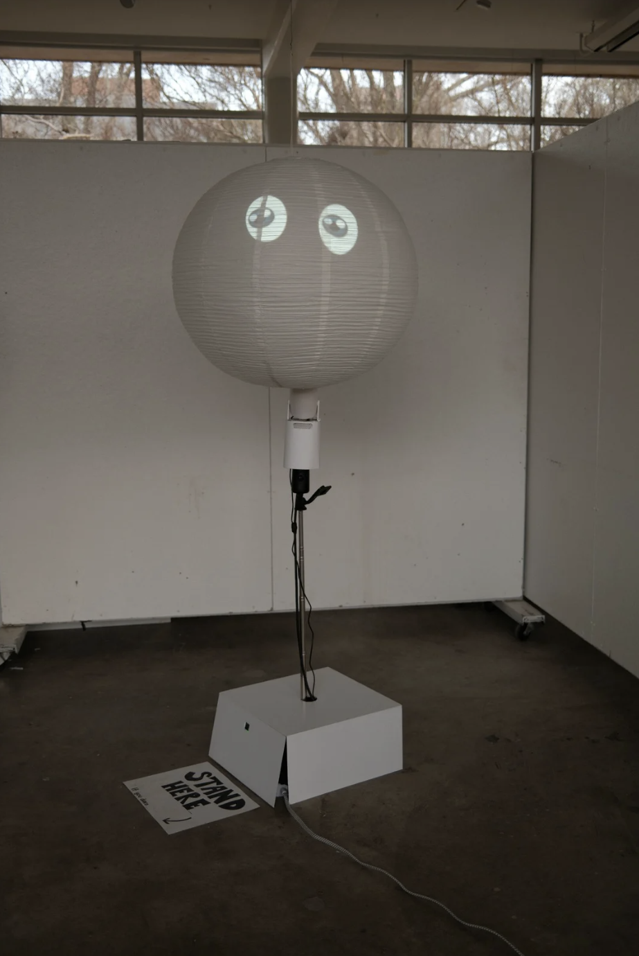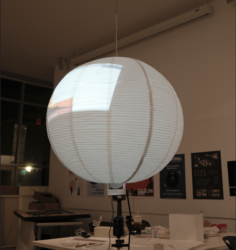 Physical fabrication was our second step, where we reinforced the sphere/lantern with wires, created the electrical housing with a foam core box, and attempted to seamlessly hide wiring and technology through the tripod pole.